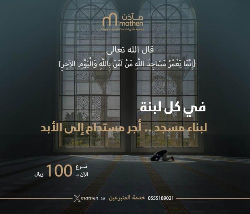 ✨ ببنائك لمسجد، تفتح أبواباً للأجر المستمر مع كل صلاة , وذكر , وعبادة تُقام فيه .